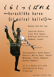 ¤¯¤é¤·¤Ã¤¯¤Ð¤ì¤¨ - Kurashikku Baree (Classical ballet) is a ballet piece which was created by using the aesthetic principles of traditional Japanese art, such as sadoh (Tea ceremony), kadoh (Flower arrangement) and Kabuki. The piece also highlights some essences of wabi sabi (the Japanese theory of aesthetics that finds beauty in transience and imperfection). The dancers' movements embody the humble, tranquil nature of Japanese art and culture. Some sections are improvised by dancers so that they are able to release and share their internal feelings. Since ballet dancers (and especially Japanese ballet dancers, I think...) tend to be more used to moving according to the choreographers' directions, my dancers from Central School of Ballet found it rather challenging to bring out the movements of their own at the beginning of this project. However, they gradually became more relaxed and comfortable with physicalising the images they have created within themselves, which can then be conveyed to the audience. The beauty is not presented and ready to be served, the audience is there to search for it, sense it and become a part of it as well. What I looked for is not a representation of Japanese art in classical ballet, but it is rather the recontextualisation of classical ballet in Japanese terms.