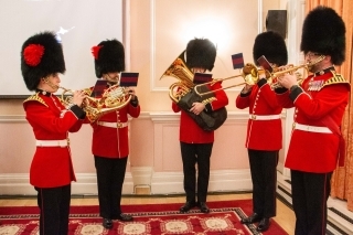 冒頭、英国近衛軍楽隊コールドストリーム・ガーズ・バンドによる日英両国の国歌演奏に続き、鈴木大使から挨拶を述べました。鈴木大使は、まず天皇陛下が66歳のお誕生日をお迎えになったことに祝意を述べられ、日英パートナーシップは日本皇室と英国王室との温かい友情で象徴されるとともに、共通の戦略的利益と基本的価値観、すなわち自由、民主主義、人権、法の支配に基づいたグローバルなパートナーシップである旨述べました。
