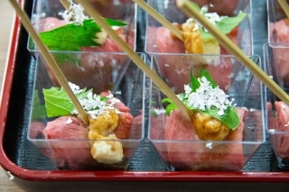 また今次レセプションにおいては、多くの日系企業や地方自治体、関係団体等の協力の下、各企業や各地の日本産品等を提供するブースの設置や盆栽の展示なども行いました。さらに、日本から英国への日本産農林水産物・食品の更なる輸出促進を図る観点から、ブースによるプロモーションのほか、和牛、日本産果物、寿司などを提供し、多くの来訪者に対して、日本食材の魅力をPRしました。ゲストの皆様が、日本酒、日本産酒類、日本食などを楽しみつつ、多面的な角度から我が国の魅力に触れる機会となりました。
